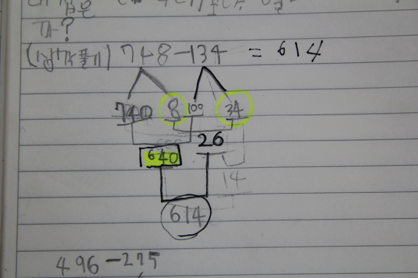 748을 740과 8으로 나눕니다. 그리곤 134를 100과 34로 나누네요. 740에서 100을 빼는 것은 이해가 됩니다. 그런데 34에서 8을 빼네요. 거꾸로 빼는 것이죠. 여기서 부터 아이들이 웅성거립니다. 이상하다고요. 그러면 안 된다고 합니다. 그래도 빼니 26이 나오고 740에서 100을 뺀 640에서 26을 빼니 614가 나옵니다. 허걱! 답과 같은 수가 나옵니다.